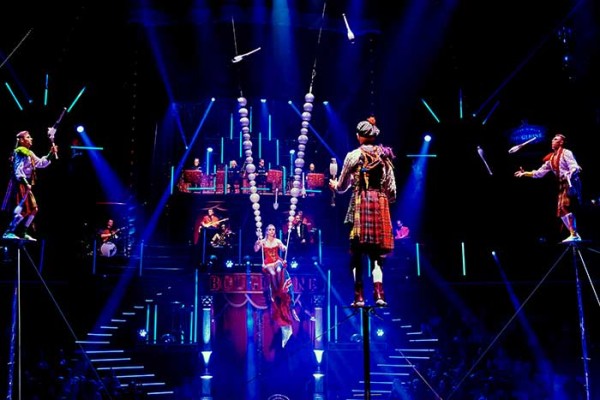 This quartet from the East has decided to think outside the box! Imagine a sort of queen, seated on her throne, ruling the roost! This is Liubov's role, who, in "mistress-wife" mode, gives his three "subjects," Maksim, Edouard, and Dmitrii, a run for their money! These four jugglers demonstrate incredible agility and originality with fascinating and spirited club throws on the ring and in the air!